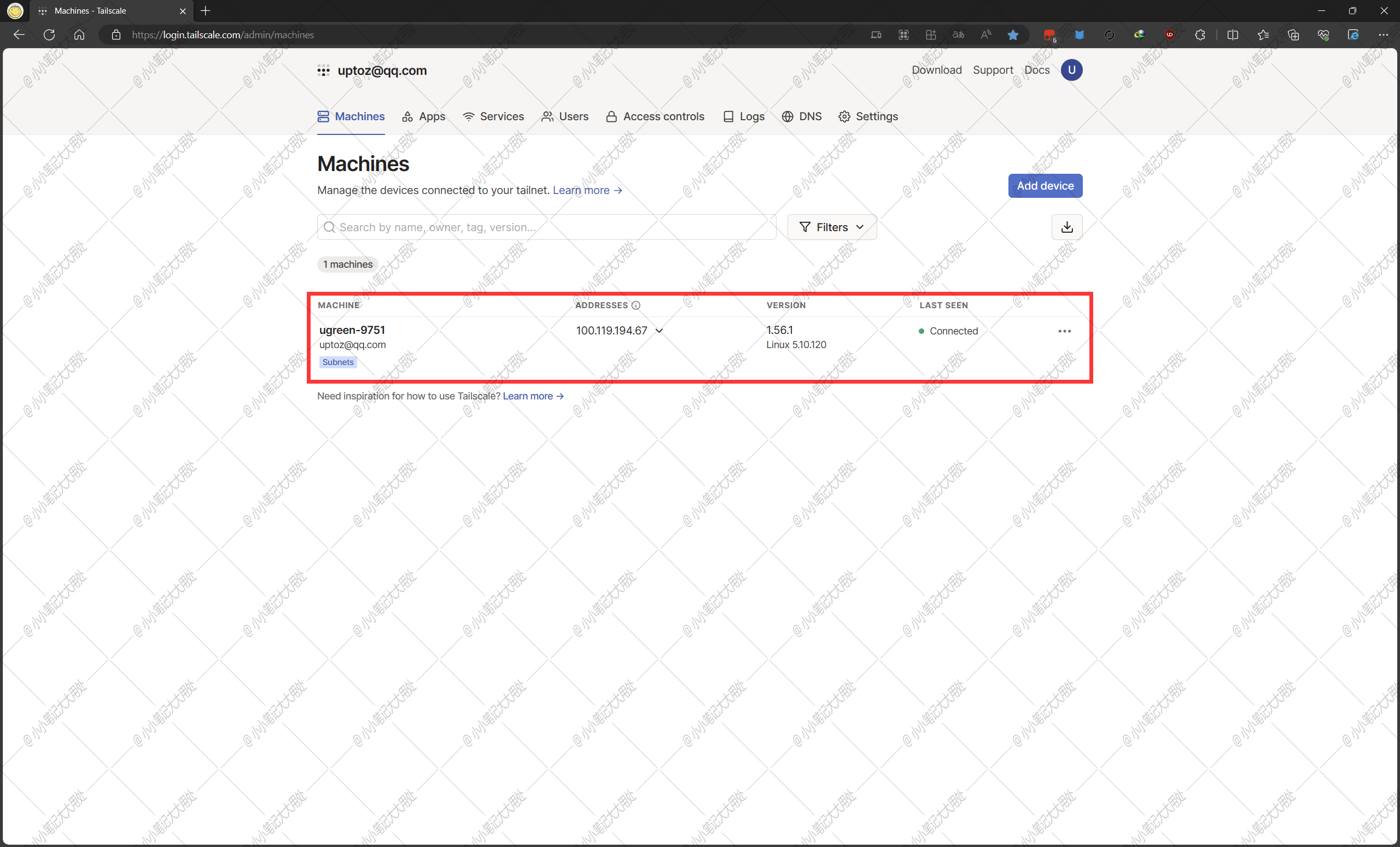 - 打开Tailscale的官网(https://login.tailscale.com/admin/machines),可以看到我们的NAS设备已经在Machines中显示了,就表示部署成功了。