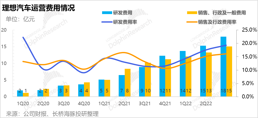 理想作为新势力当中车型少而且技术上只是过渡型增程而无纯电车的理想而言,内部开支上关键是研发投入,目的是增强后面产品线的确定性。而作为上升期的造车新势力,铺开自己的销售网络、扩大城市覆盖也是短期内无论销量是否通畅,也要持续去做的事情。
