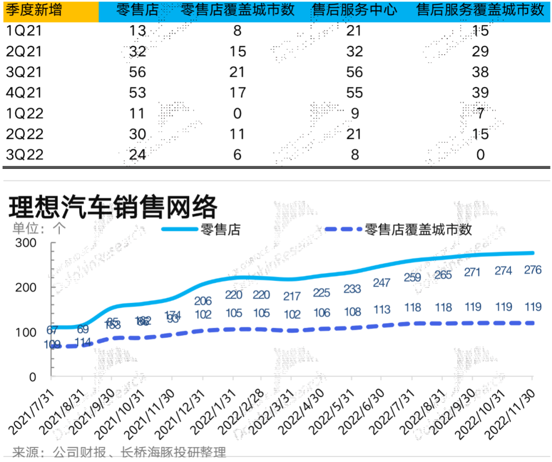 (2)销售和行政费用两项的投入是小超15亿,还算相对克制,毕竟9月底发了两辆新车,三季度销售网络的拓展也没有明显落下。而销售费用率16.1%,同比环比都有明显飙升,主要还是三季度青黄不接的销量无法稀释刚性增长的销售费用。在销售网络拓展上:整个三季度期间新增零售店面24家,新曾覆盖的城市多了6个,基本正常。而四季度已经过完两个月的情况下,11月底城市覆盖还是119个,没有新增,零售店也就是多增了5家,到了276家。这也意味着理想年初定的400家零售店目标在疫情干扰和竞争加剧的情况下已经无法完成。