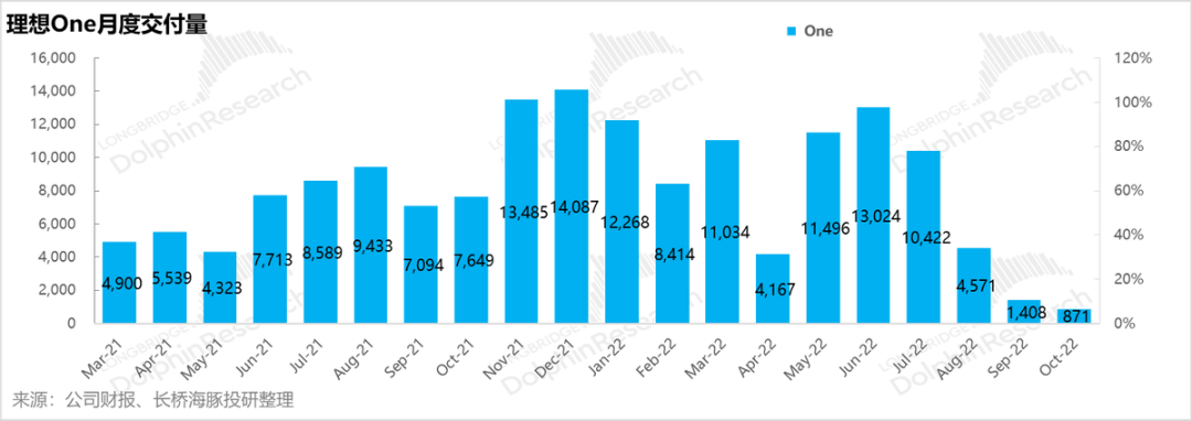 本次财报出来,最让海豚君意外的就是理想汽车销售业务的毛利率“崩盘”。作为每次财报出来之后除了销量指引之外市场最为关注的核心指标,这个季度汽车销售业务毛利率只有12%,瞬间滑到了小鹏、零跑之流的水平,远远低于自己以往20%+以及市场对本季度20.8%的毛利率预期。而仔细看问题的关键,还是理想One销量下滑太快的“反噬”:在产品的更新换代中,理想One月销从一万以上两个月快速滑到了单月不足2000辆。