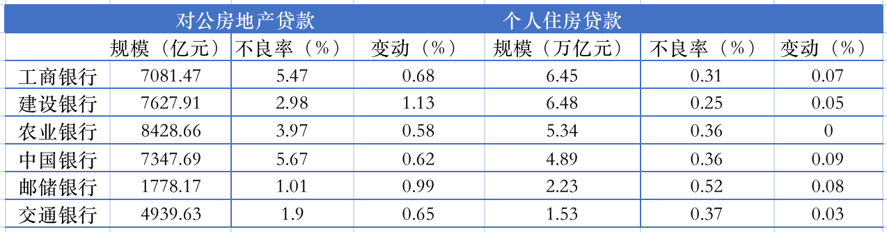 个人住房贷款方面,不良率虽然绝对值较低,但除农行没有变化外,其他五家银行的个人住房贷款不良率与去年末相比集体抬升。