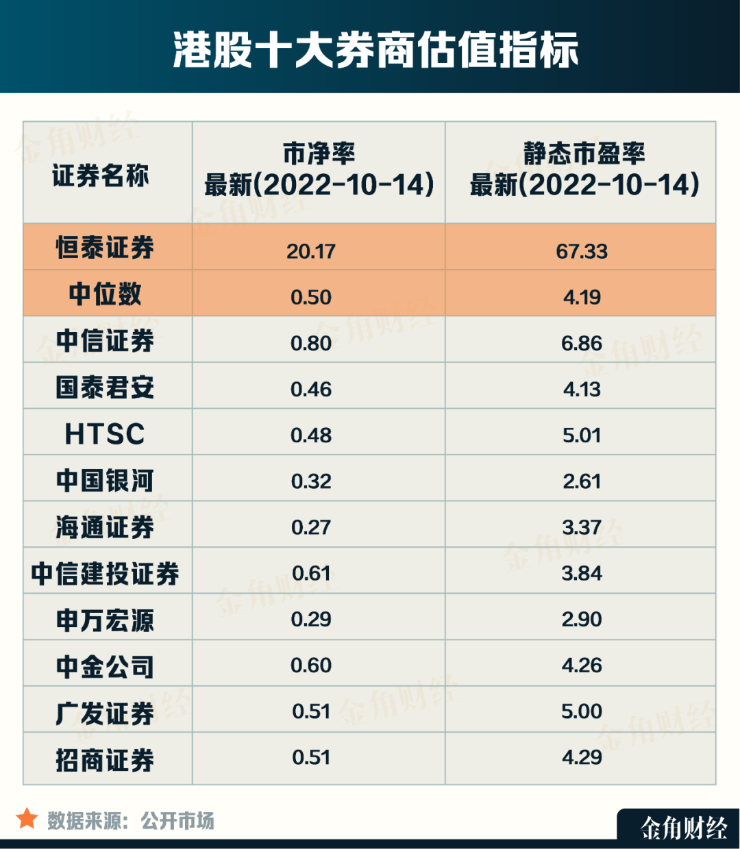 以去年年末净资产计算,恒泰证券在上述交易的市净率达到惊人的20.17倍,港股十大券商全部“破净”,中位数仅为0.50倍。