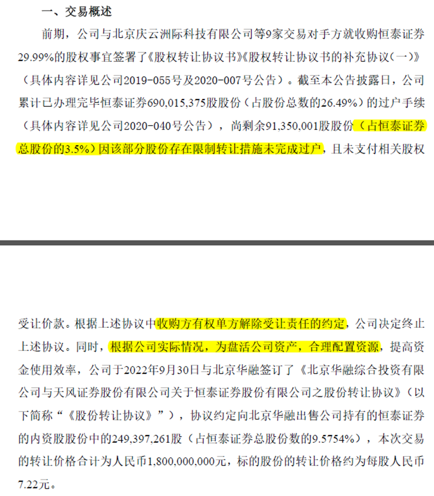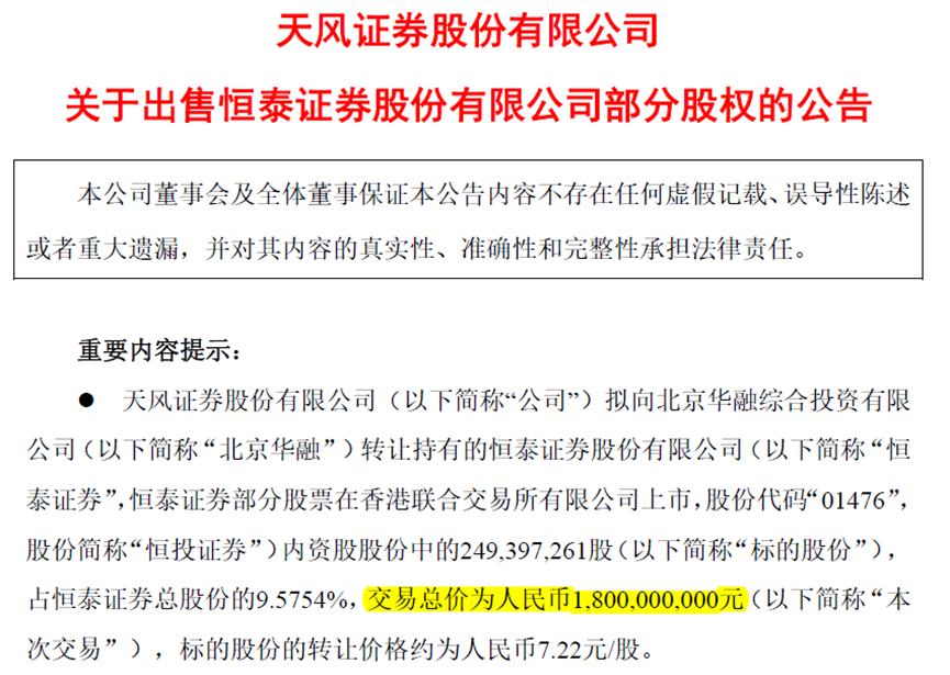 9月30日,天风证券发公告称,与北京华融签订了股权转让协议,拟转让持有的恒泰证券9.5754%股权,转让总价18亿元,折合每股价格约7.22元。