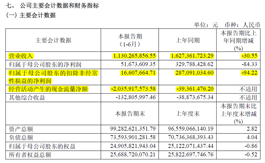 扣非后归母净利润仅1660万,去年同期为2.87亿,**同比下跌94.22%**;