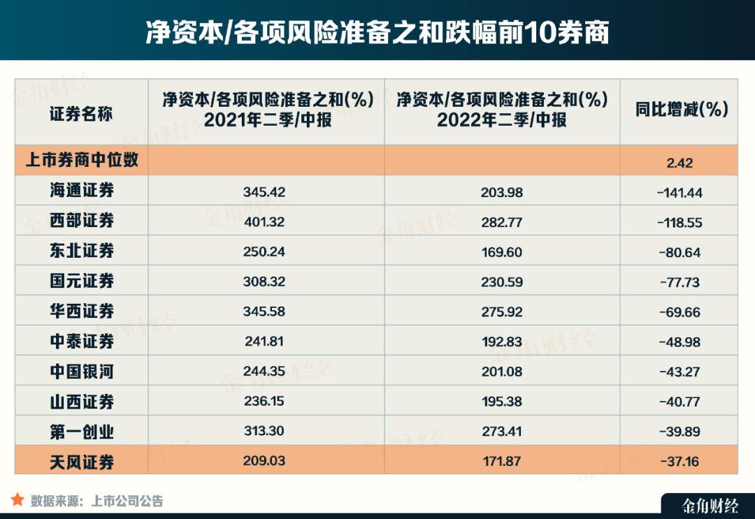 净资本/各项风险准备之和为171.87%,去年同期为209.03%,同比减少37.16%,跌幅位居上市券商第十,上市券商同比增减的中位数为2.42%;