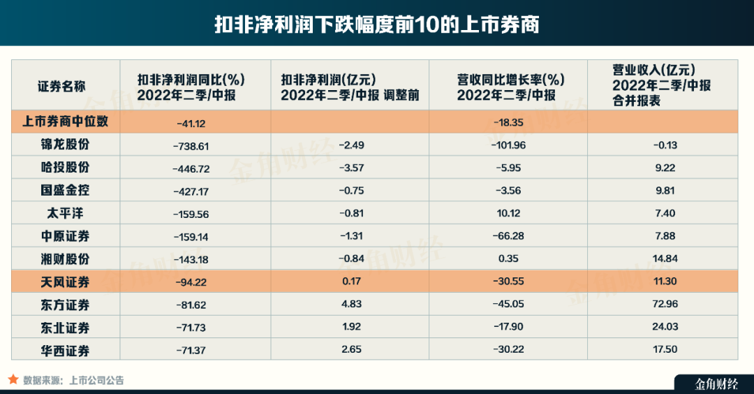 扣非净利润下跌幅度排在第七名,A股上市券商跌幅中位数为41.12%,天风证券的跌幅超过行业中位数的两倍;