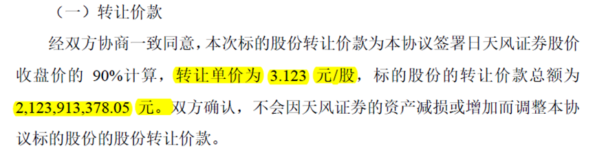 公告显示,转让单价为协议签署日(3月31日)收盘价的90%,即3.123元/股。今年一季度,天风证券股价成交均价为3.71元,最高价为4.10元。