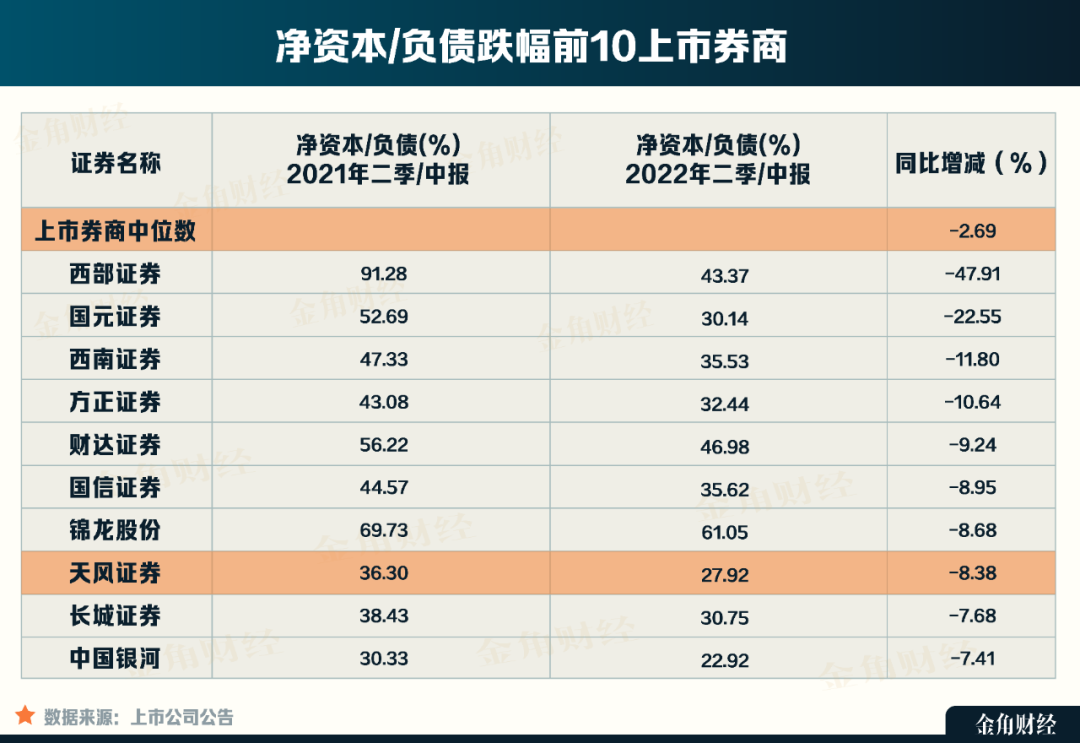 净资本/负债为27.92%,去年同期为36.30%,同比减少8.38%,跌幅位居上市券商第八,上市券商同比增减的中位数为-2.69%。