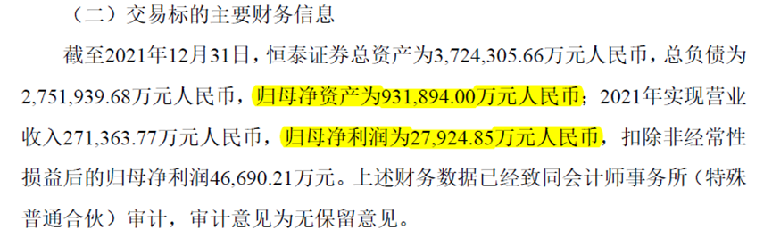以9.5754%股份对应18亿交易总价,恒泰证券估值达到188亿,而恒泰证券2021年财务数据显示,去年归母净利润仅有2.79亿,净资产为9.31亿。
