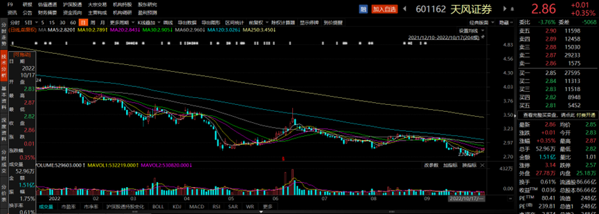 但是,天风证券的股价并未停止下跌。在协议签署后截至10月17日,天风证券收盘价报2.86元,比宏泰集团首次收购时的价格还低了8.4%。