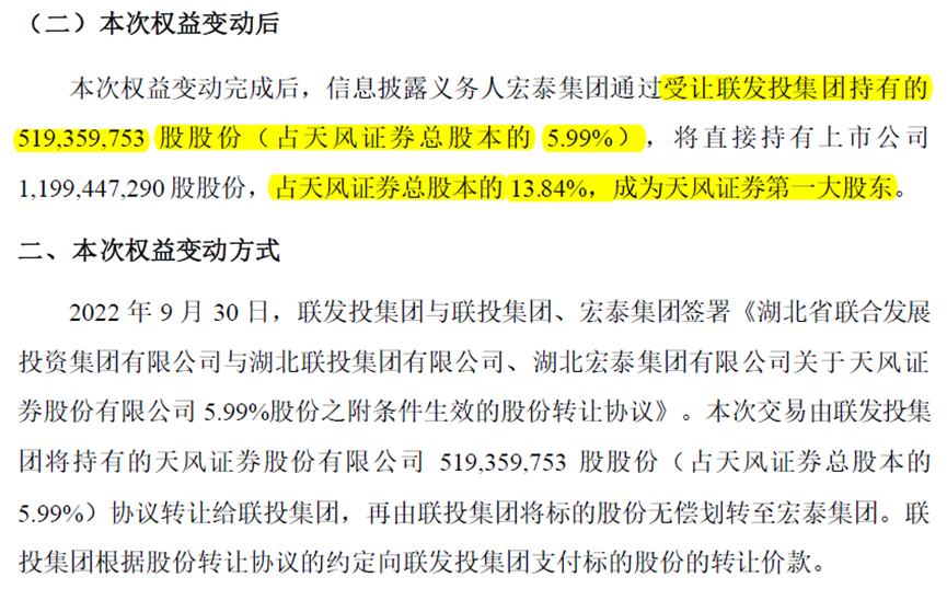 转让完成后,宏泰集团将直接持有天风证券11.99亿股股份,占总股本的13.84%,成为天风证券第一大股东,并且是惟一持股比例超过10%的股东。