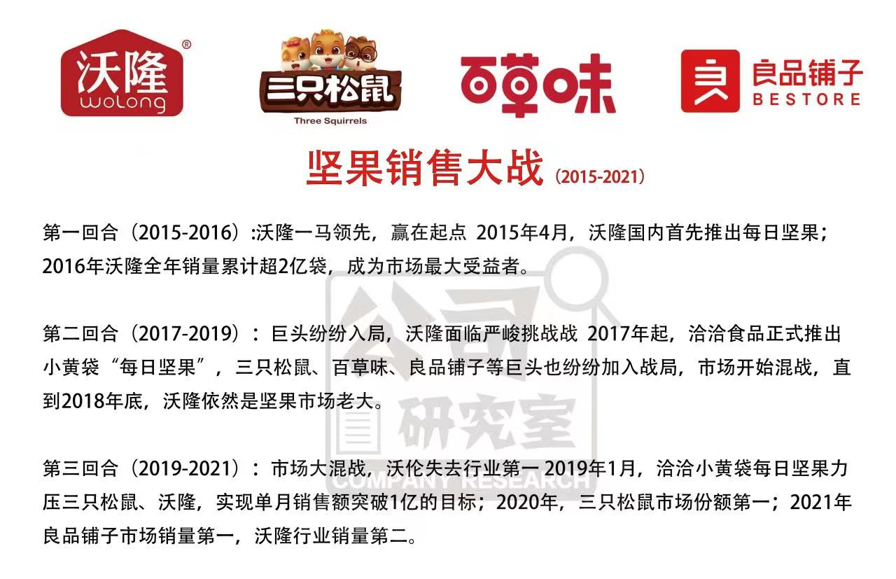 无论如何,在激烈的市场竞争中,沃隆食品最终失去了坚果市场老大地位。2020年,三只松鼠成为行业第一,市场份额为10.2%;2021年,洽洽食品取代三只松鼠,市场份额为9.7%。当年,沃隆食品销量第二,市场份额为 9.3%。