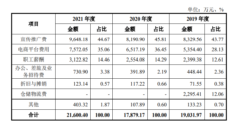 公司称,由于近年来竞品增多,公司逐步加强了线下渠道建设和推广力度,总体上增加了对宣传推广费的支出。电商平台费用主要为公司在天猫、京东等电商平台上的推广费用,报告期内 公司逐步加强对电商平台的资源投入,电商平台费用持续增长,线上渠道的收入规模亦同步增长。职工薪酬主要系当期销售人员薪酬,报告期内总体稳定。