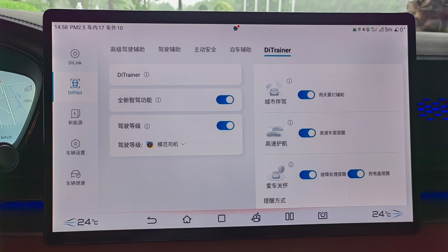 DiTrainer教练模式联动车机端与手机端,为用户打造了全新智驾和驾驶等级两项功能。其中,全新智驾功能围绕“护航”的目的,制定了“城市伴驾、高速护航、爱车关怀”三个维度四项功能,车主能够自主选择功能方案的组合以及提醒方式,在护航的同时真正理解用户需求。