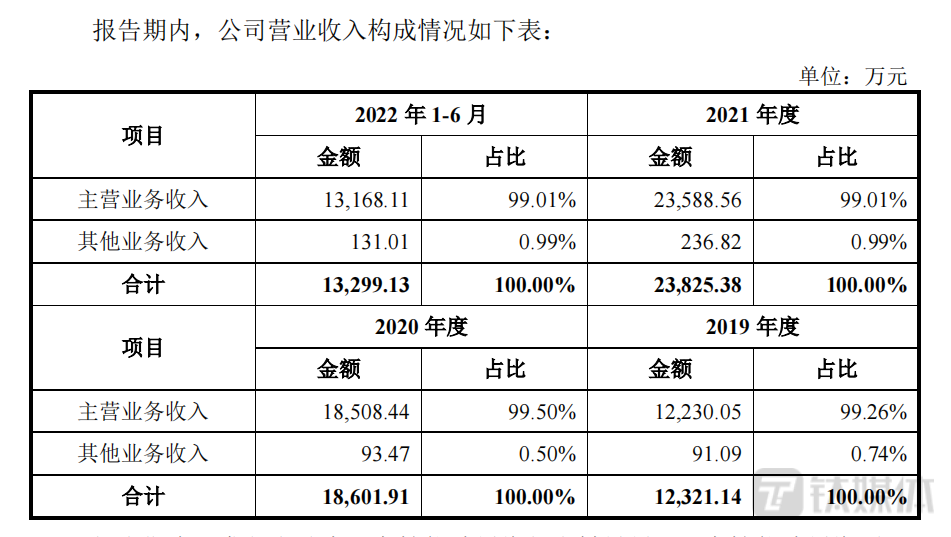 报告期内,晋飞碳纤分别实现营业收入1.23亿元、1.86亿元、2.38亿元及1.33亿元,主营业务收入占比分别达到99.26%、99.50%、99.01%及99.01%。