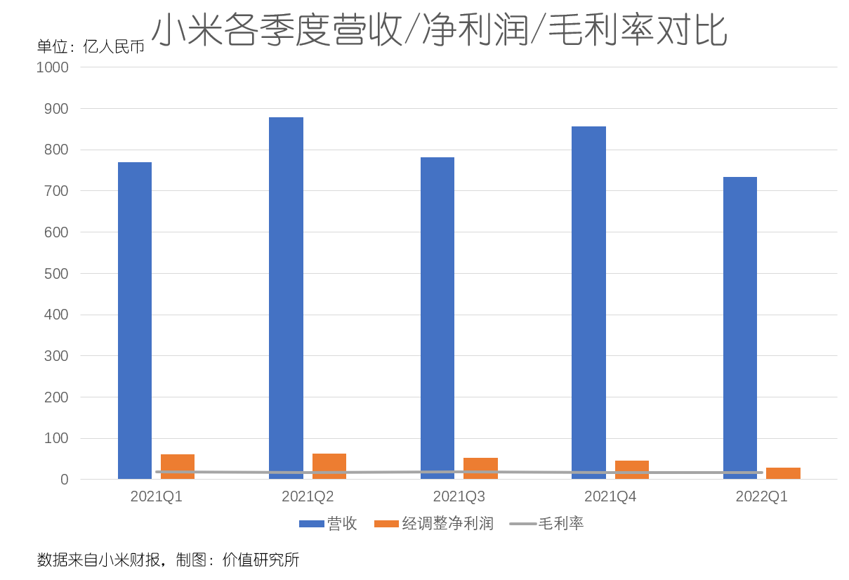 5月19日港股盘后,小米公布2022财年一季度财报,多项数据令人失望:总营收为734亿元,虽稍高于市场预期,但同比录得4.6%的跌幅;经调整净利润仅录得28.59亿,同比大跌52.9%,同时还刷新了一系列尴尬纪录;整体毛利率为17.1%,同比下滑1.1%,127亿的毛利润也是2020年四季度以来的最低点……