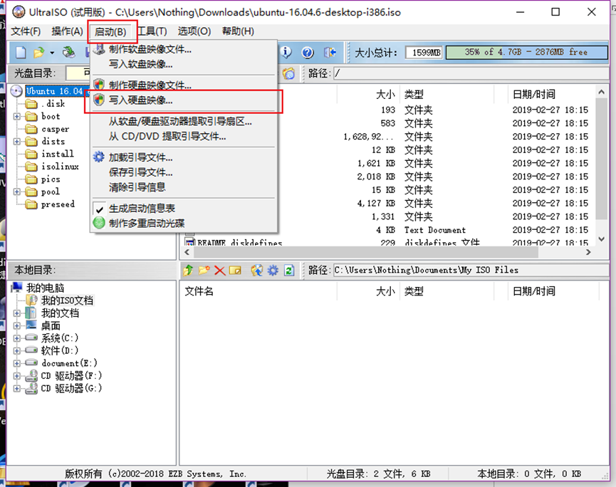 将镜像文件加载进来之后,我们点击顶部上的菜单“启动”,展开,然后选择“写入硬盘镜像”