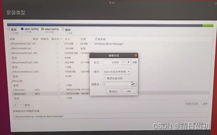 选项:/swap 逻辑分区 swap分区 大小为内存为100G(挂载点:交换空间,相当于windows中