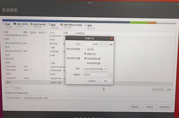 (3)/boot 逻辑分区 大小为2G(500M~1G)(挂载点:EXT4日志文件系统,启动引导项,存放系统启动时所需的文件)(逻辑分区,空间起始位置)