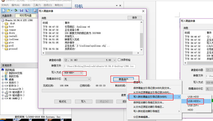进入了写入硬盘镜像的主界面,在主界面,有“硬盘驱动器”,“映像文件”,“写入方式”等组成。选择自己需要进行操作的U盘格式化。写入方式选择USB-HDD+,点击“便捷启动”,然后再弹出的菜单中依次选择“写入新的硬盘主引导记录”,再选“USB-HDD+”