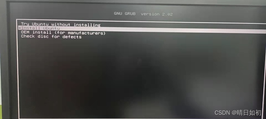 步骤:插好启动的U盘- --开机---一直按F12(看电脑型号)---进入bios界面 –选择USB启动项---选择进入 install Ubuntu