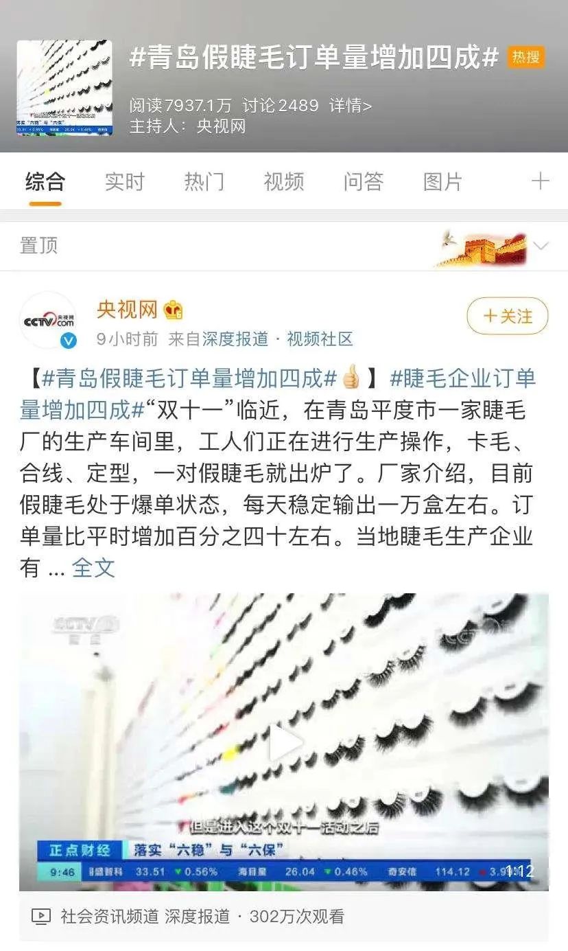 青岛的假睫毛更是因为双十的销量太过巨大直接火上了热搜。根据睫毛厂商的反馈,双十一为平度的睫毛厂们增加了将近四成的订单,寒冷的深夜里依然灯火通明的睫毛厂们即使每天出货近2万盒假睫毛,依然是供不应求。