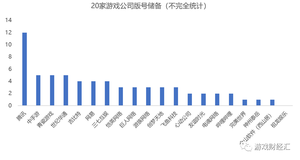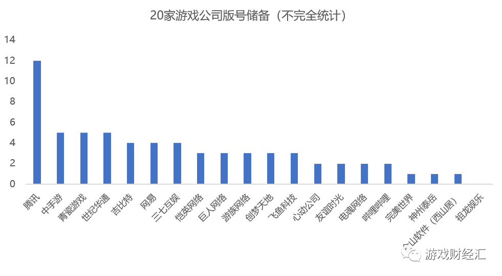 据游戏财经汇不完全统计,20家游戏公司共储备了65个游戏版号。