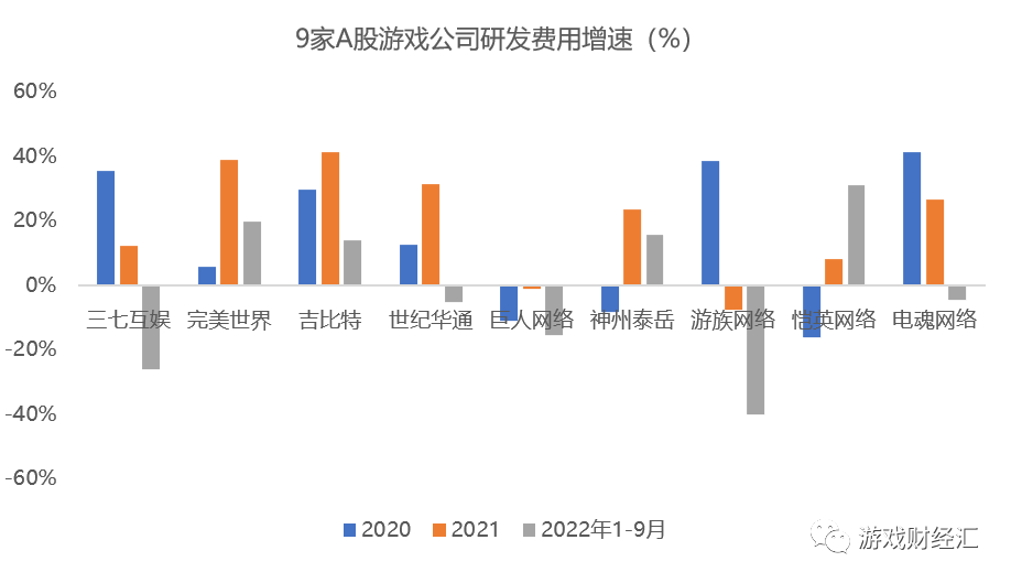 从研发费用增速来看,9家A股上市公司中,半数以上的公司今年的研发费用同比出现下滑,降幅最大的是游族网络,同比降幅超40%,增幅最大的是恺英网络,不过恺英网络研发费用基数较低。