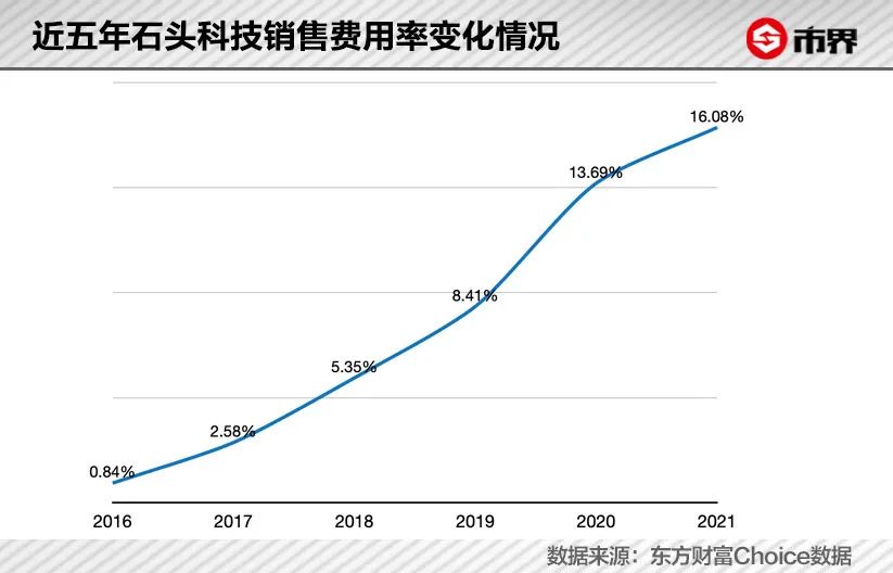 2020年与2021年,石头科技销售费用分别为6.2亿元、9.38亿元,分别增长了75.24%、67.74%。销售费用率近几年也在持续上升。