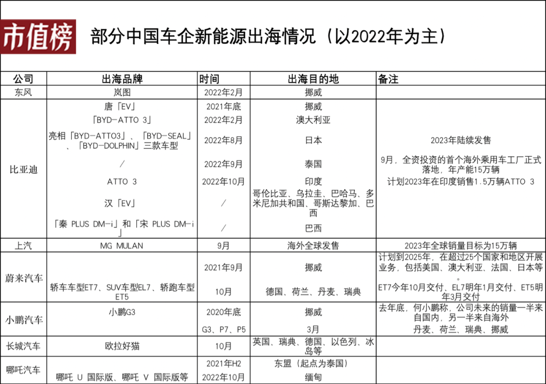 但我们同样不能忽视本土车企的努力,今年以来,多家车企都加快了海外市场的布局节奏,出海目的地更加多元、出海车型也越来越多,如下图所示(市值榜不完全统计)。