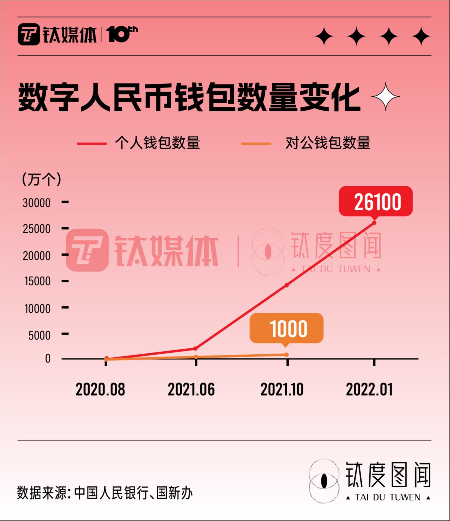 试点地区数量迅速增加,数字人民币的普及也在提速。数字钱包作为数字人民币的载体和触达用户的媒介,最新数据显示,数字人民币累计开立个人钱包数量从11.33万个暴增到2.61亿个,对公钱包数量从0.89万个增长到1000万个,都呈现出快速提升的趋势。