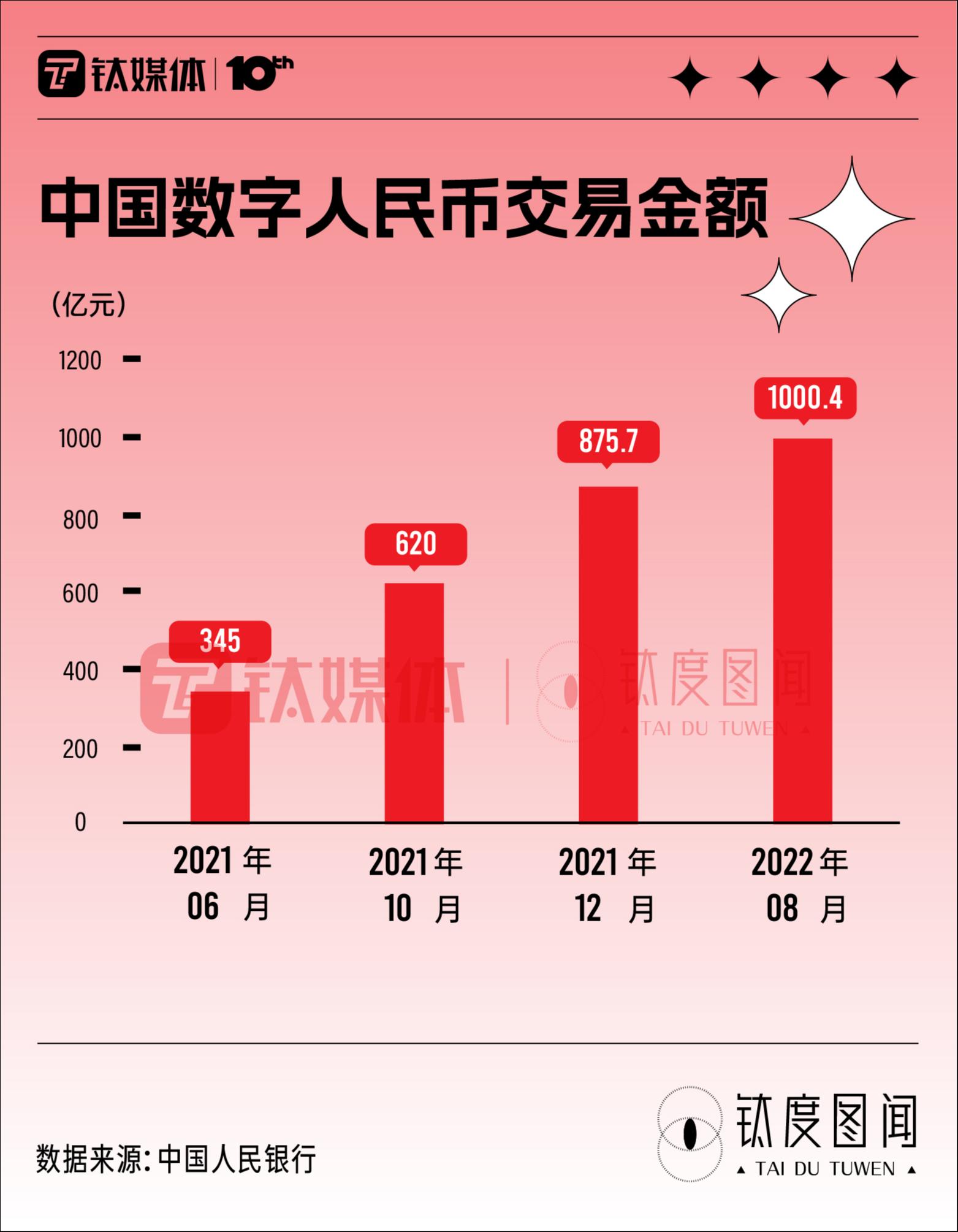 从数字人民币交易额来看,截至2022年8月底,试点地区累计交易笔数3.6亿笔,交易金额破千亿,达1000.4亿元,相比于2021年6月,交易金额增长了近3倍。