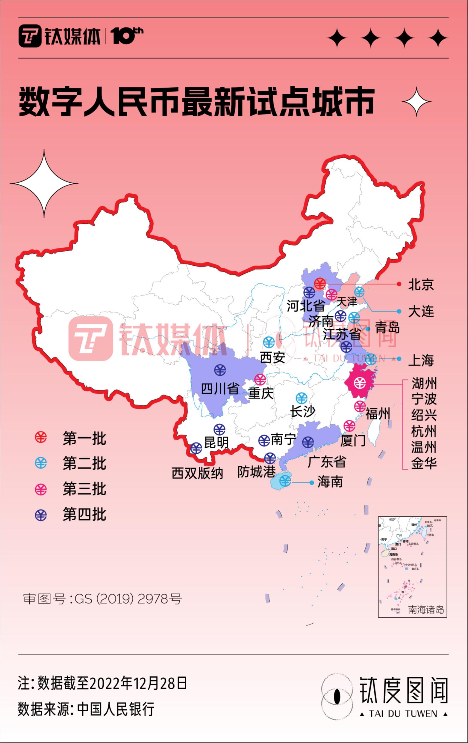 2022年12月,数字人民币试点城市再次扩大范围,在现有试点地区的基础上,由第一批试点城市深圳、苏州、雄安、成都扩展至广东、江苏、河北、四川全省,并增加山东省济南市、广西壮族自治区南宁市、防城港市和云南省昆明市、西双版纳傣族自治州作为试点地区。