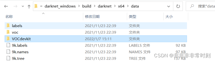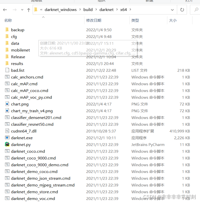 其中除了Annotations、JPEGImages、ImageSets、VOC2007、VOCdevkit以外都是Darknet自带的或通过代码自动生成的