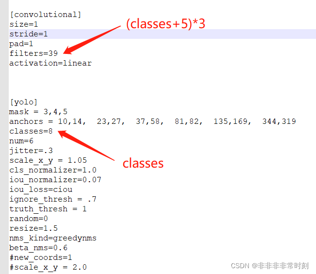 主要修改,如上图所示的【convolutional】和【yolo】组(在yolo-tiny算法中共两组,yolo算法中三组)