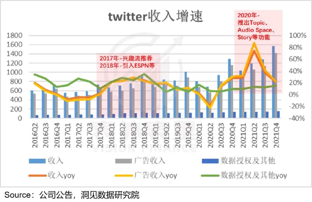 点击率和转化率提升,反映在财务上,就是2020Q4开始,Twitter的广告收入增速猛涨。