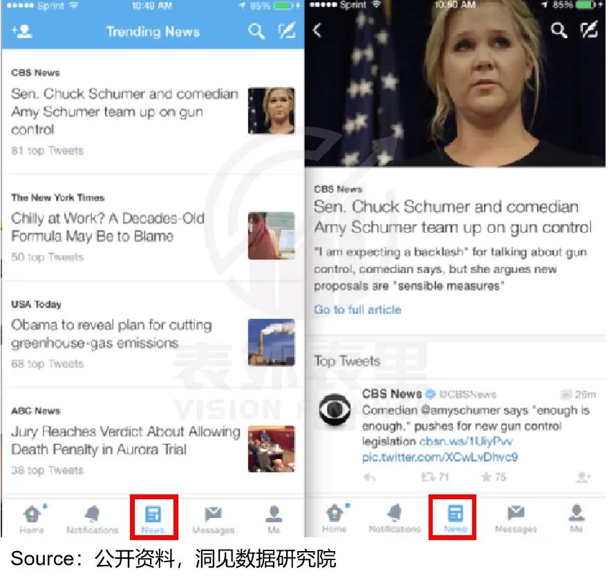 比如,2011年上线新闻资源整合平台Twitter for Newsrooms,优化发布端;2015年在应用导航栏单独设立新闻标签,方便用户阅读资讯。