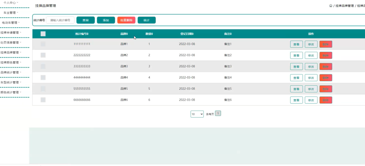 挂牌品牌管理,在挂牌品牌管理页面可以对统计编号、品牌、数量、登记日期、备注等内容进行查看、修改或删除等操作,如图5-7所示。