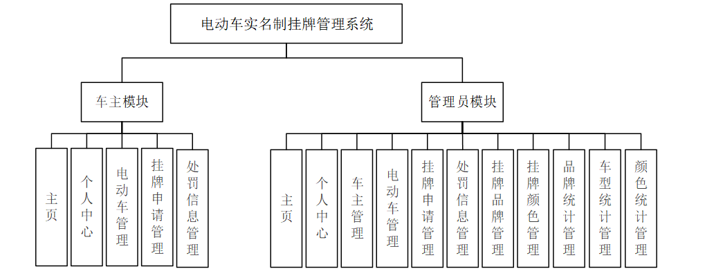 为了更好的去理清本系统整体思路,对该系统以结构图的形式表达出来,设计实现该电动车实名制挂牌管理系统的功能结构图如下所示: