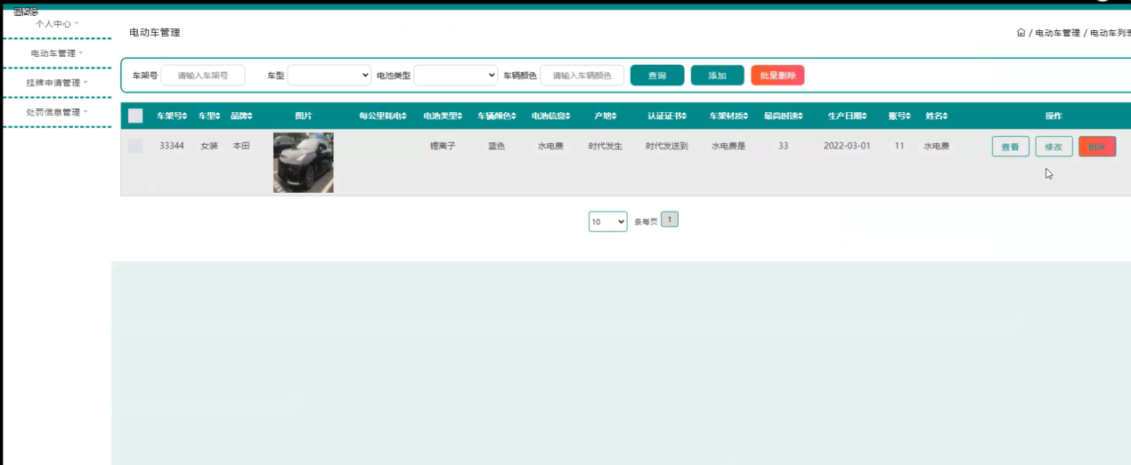 电动车管理,在电动车管理页面可以对车架号、车型、品牌、图片、每公里耗电、电池类型、车辆颜色、电池信息、产地、认证证书、车架材质、最高时速、生产日期、账号、姓名等内容进行查看、修改或删除等操作,如图5-4所示。