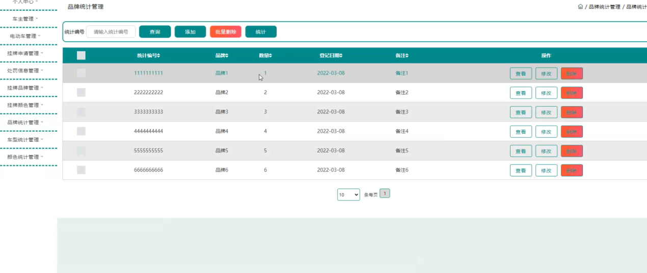 品牌统计管理,在品牌统计管理页面可以对统计编号、品牌、数量、登记日期、备注等内容进行查看、修改或删除等操作,如图5-9所示。
