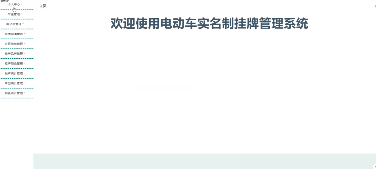 管理员登陆系统后,可以查看主页、个人中心、车主管理、电动车管理、挂牌申请管理、处罚信息管理,挂牌品牌管理、挂牌颜色管理、品牌统计管理、车型统计管理、颜色统计管理等功能,还能对每个功能逐一进行相应操作,如图5-2所示。