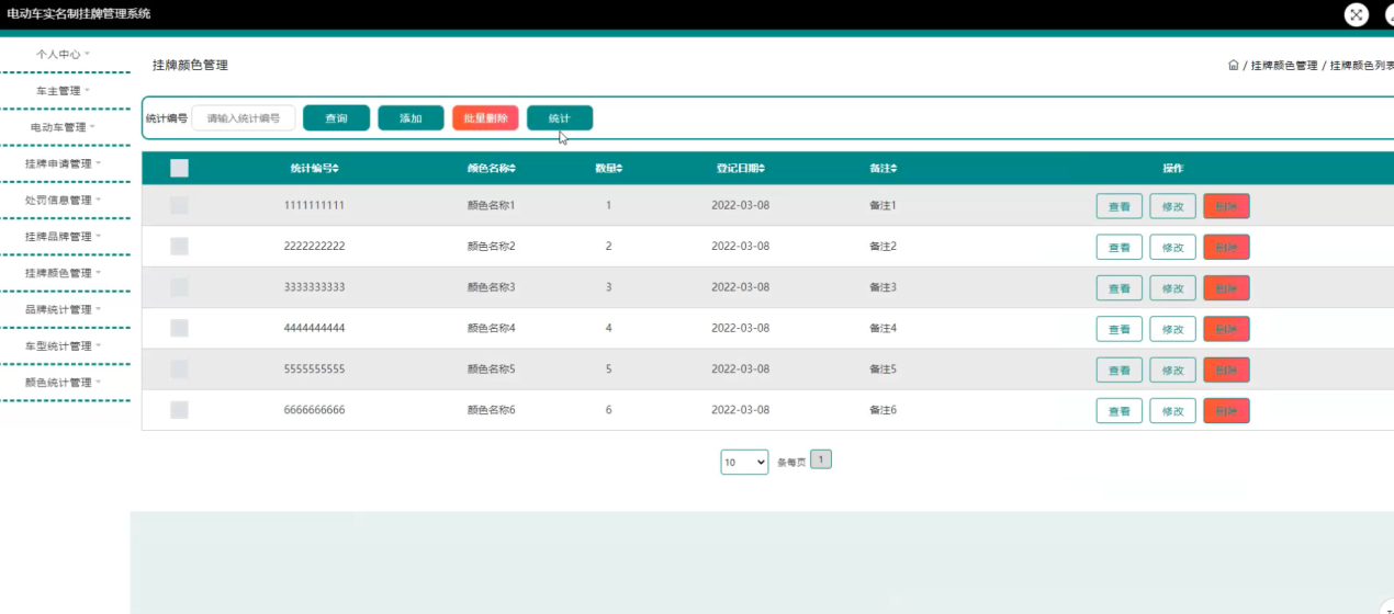 挂牌颜色管理,在挂牌颜色管理页面可以对统计编号、颜色名称、数量、登记日期、备注等内容进行查看、修改或删除等操作,如图5-8所示。