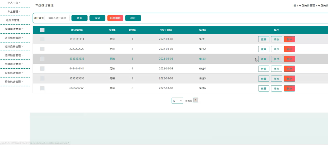 车型统计管理,在车型统计管理页面可以对统计编号、车型、数量、登记日期、备注等内容进行查看、修改或删除等操作,如图5-10所示。