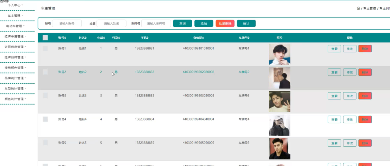 车主管理,在车主管理页面可以对账号、姓名、年龄、性别、手机、身份证、车牌号、照片等内容进行查看、修改或删除等操作,如图5-3所示。