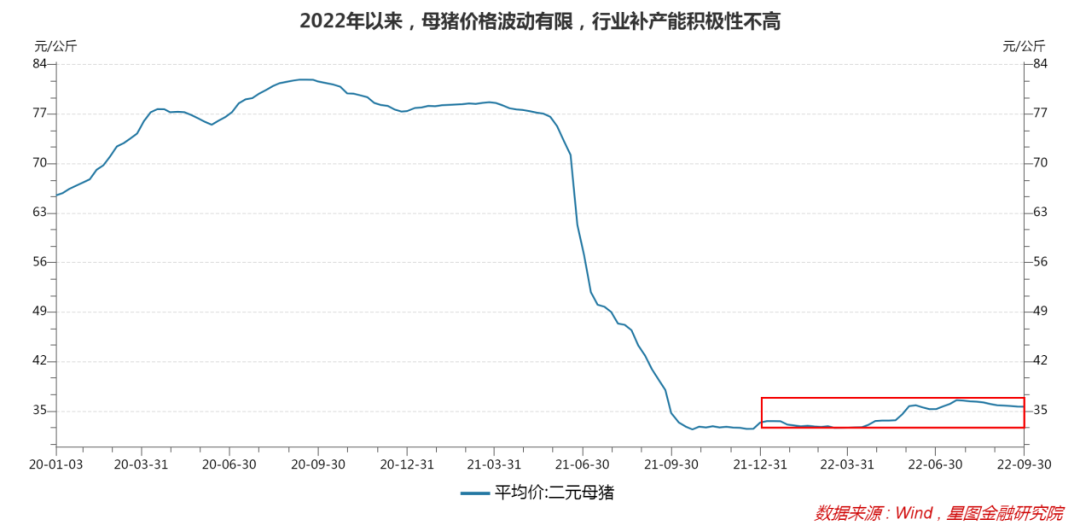 从母猪价格来看,2022年整体波动很小,且8月以来便呈现小幅下行趋势,表明行业对2023年猪价并不看好,补产能积极性不足。