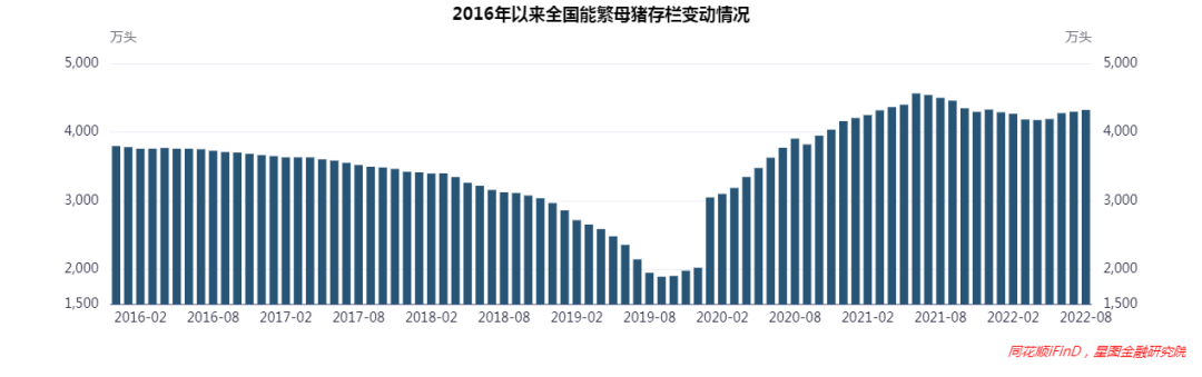 而2022年4月的去化低点为4177万头,仍略高于国家调控区间的上限;截至2022年8月,能繁母猪存栏已攀升至4324万头。这意味着,2023年的生猪供应并不紧缺,甚至供大于求,猪价大概率在春节消费旺季之后回落。