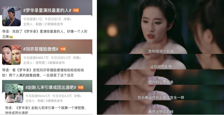 总的来看,采取电影向口碑营销,围绕男女主CP感、女性励志等话题做延伸,再借助回忆杀、玩梗、跨界营销等手法延续剧集热度,《梦华录》的整个营销思路和落实方针,基本上可圈可点。但当所有营销蜂拥而来,观众的逆反心理也就随之流露。
