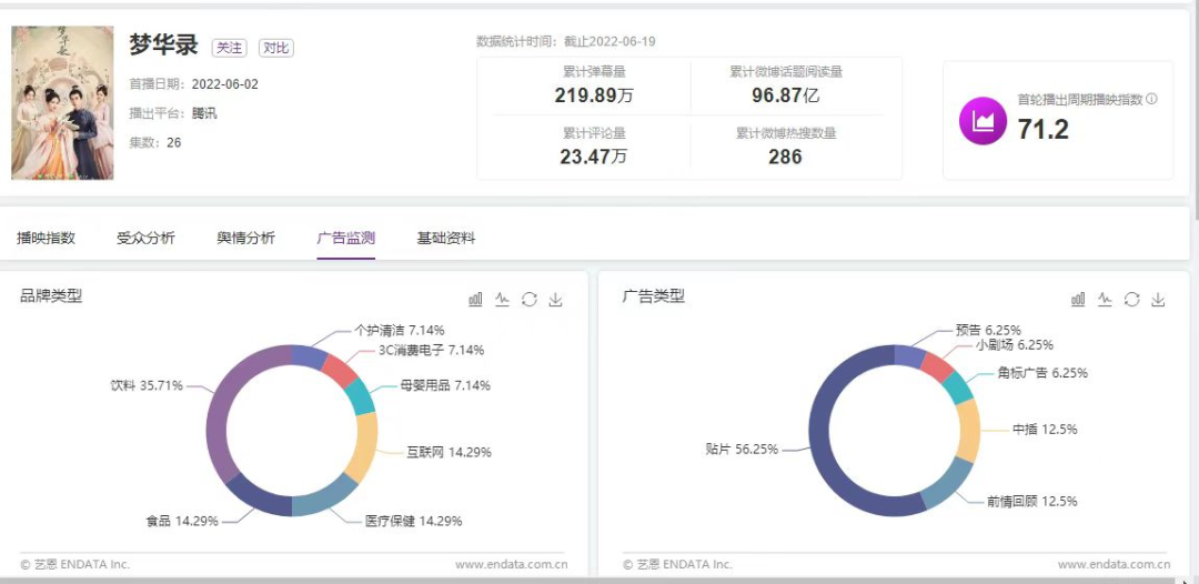 “我看了《梦华录》中的一些广告片单,他们多以硬广植入较多。比如每集片头都会放三到四个广告商,播至中段会加入中插广告。” 在广告形式上,《梦华录》的植入确实不算突出,但比起一些明显‘出戏’的软植入,口播至少不会翻车。