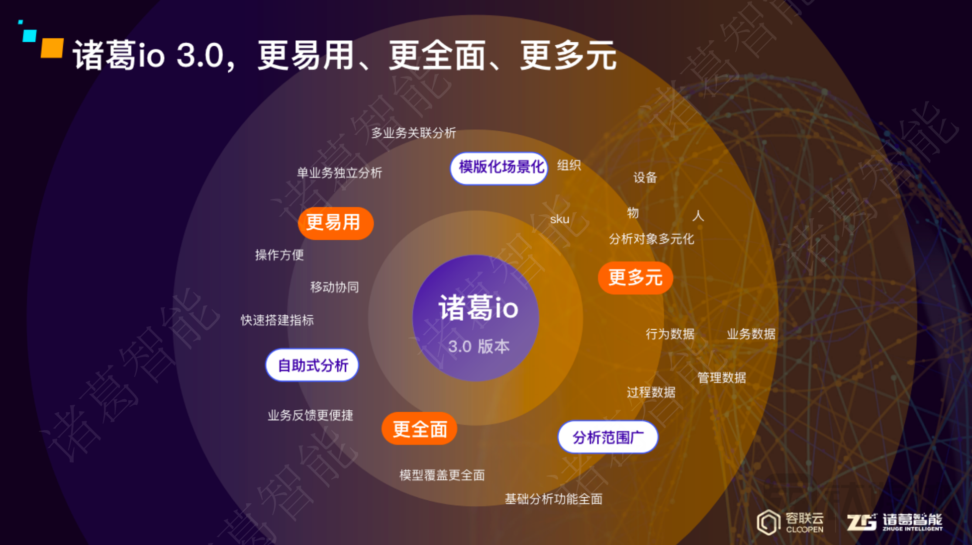 会上,诸葛智能创始人&CEO孔淼发表主题演讲,分享对数字化经营的最新思考与落地产品方案。诸葛智能数据产品经理高策、诸葛智能产品总监徐晨、诸葛智能CTO文革针对诸葛智能从数据采集、分析到营销方面的全域闭环产品及能力进行深入解读,并重磅推出诸葛CDP 2.0、诸葛io 3.0、诸葛CEP 2.0三大产品升级。